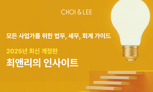 최앤리는 모든 사업가의 창의와 혁신이 마음껏 발휘되는 세상을 꿈꿉니다. 우리의 전문 지식이 여러분의 사업에 날개를 달아줄 수 있도록 사업가에게 필요한 법무, 세무, 회계 지식을 조건없이(!) 대방출합니다. 최앤리와 마일스톤이 함께 만들고, 매년 꼼꼼히 검토하여 개정해 온 인사이트 시리즈. 열어보면 현업에 바로 써먹을 수 있는 내용과 퀄리티에 놀라실 겁니다. 필요할 때 언제든지 다운받고, 여러분 사업에 필요한 인사이트를 얻어가세요.
